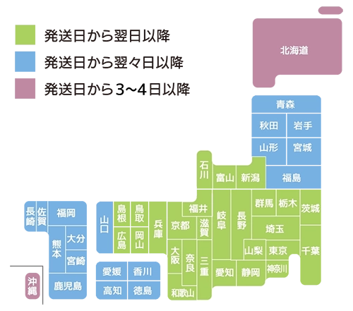 ※北海道・沖縄県の一部、離島は発送日より4日以上かかる場合もございます。ご相談ください。